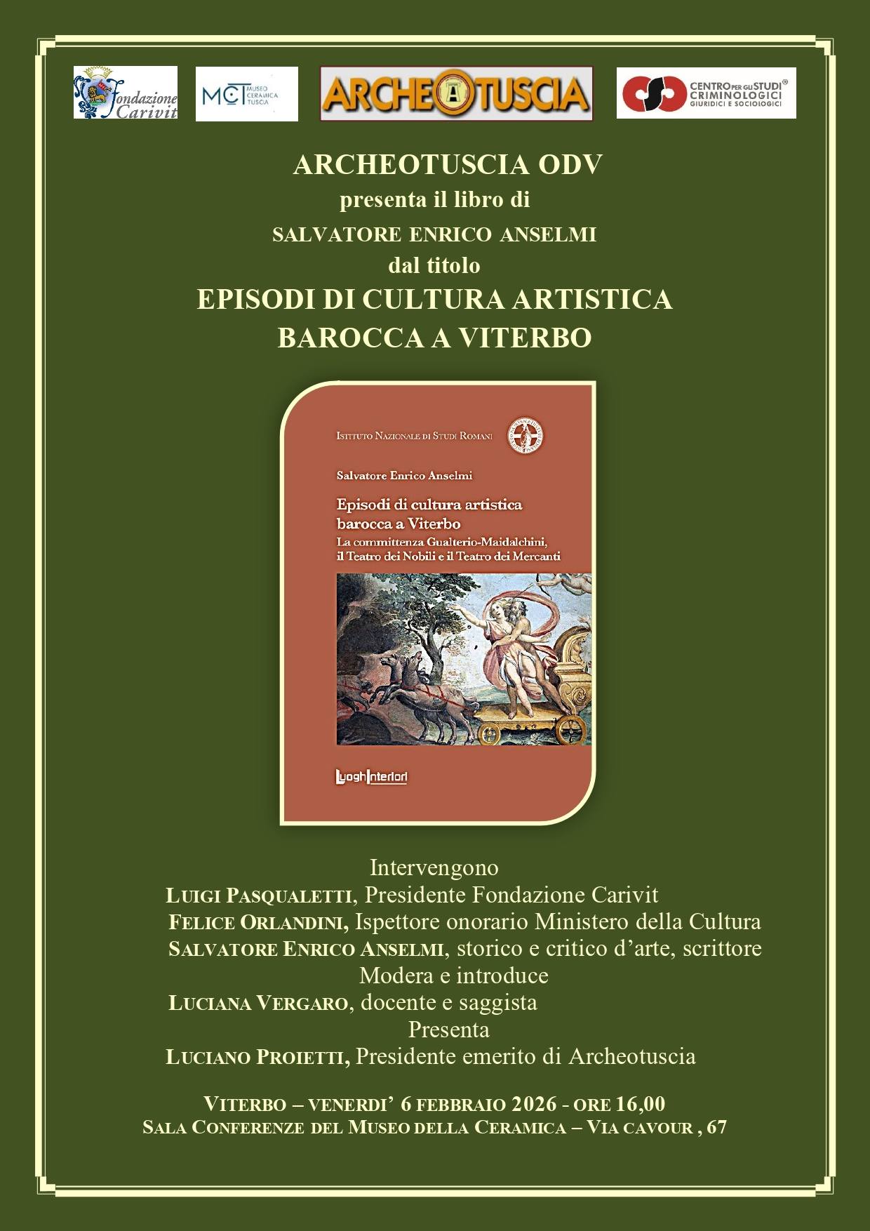 Archeotuscia Odv presenta il libro di Salvatore Enrico Anselmi Episodi di cultura artistica barocca a Viterbo. La committenza Gualterio-Maidalchini, il Teatro dei Nobili e il Teatro dei Mercanti, Roma 2025, pubblicato in coedizione dall’Istituto Nazionale di Studi Romani e LuoghInteriori, venerdì 6 febbraio 2026, alle ore 16, presso il Museo della Ceramica – Palazzo Brugiotti, via Cavour 67 a Viterbo.