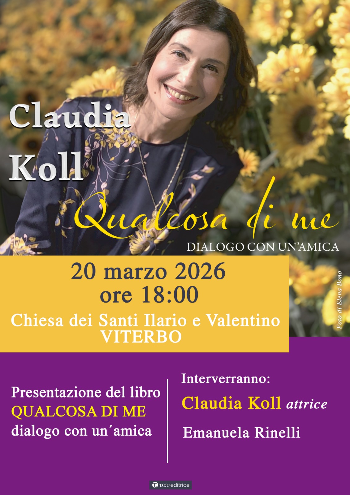 Un appuntamento speciale dedicato alla cultura e alla riflessione: venerdì 20 marzo 2026 alle ore 18:00, presso la Chiesa dei Santi Ilario e Valentino di Viterbo, si terrà la presentazione del libro “Qualcosa di me – Dialogo con un’amica” di Claudia Koll.