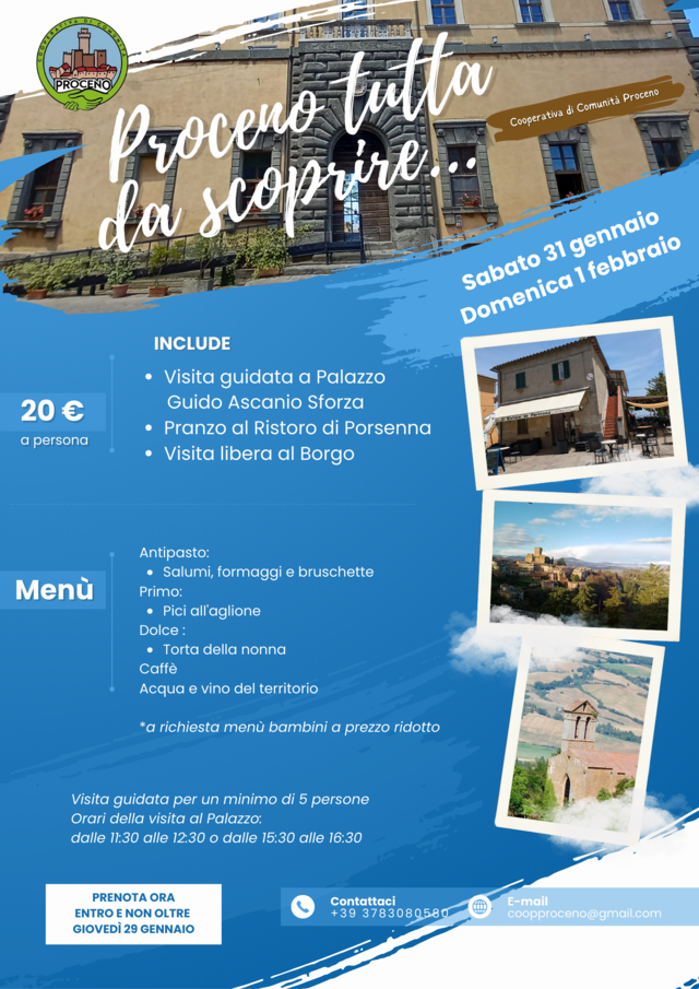 Un borgo ricco di storia, un palazzo rinascimentale di grande fascino e i sapori della tradizione locale: sabato 31 gennaio e domenica 1 febbraio si dà avvio all’iniziativa “Proceno, tutta da scoprire…”, promossa dalla Cooperativa di Comunità di Proceno e patrocinata dal Comune di Proceno, con l’obiettivo di valorizzare il patrimonio culturale, storico ed enogastronomico del territorio.