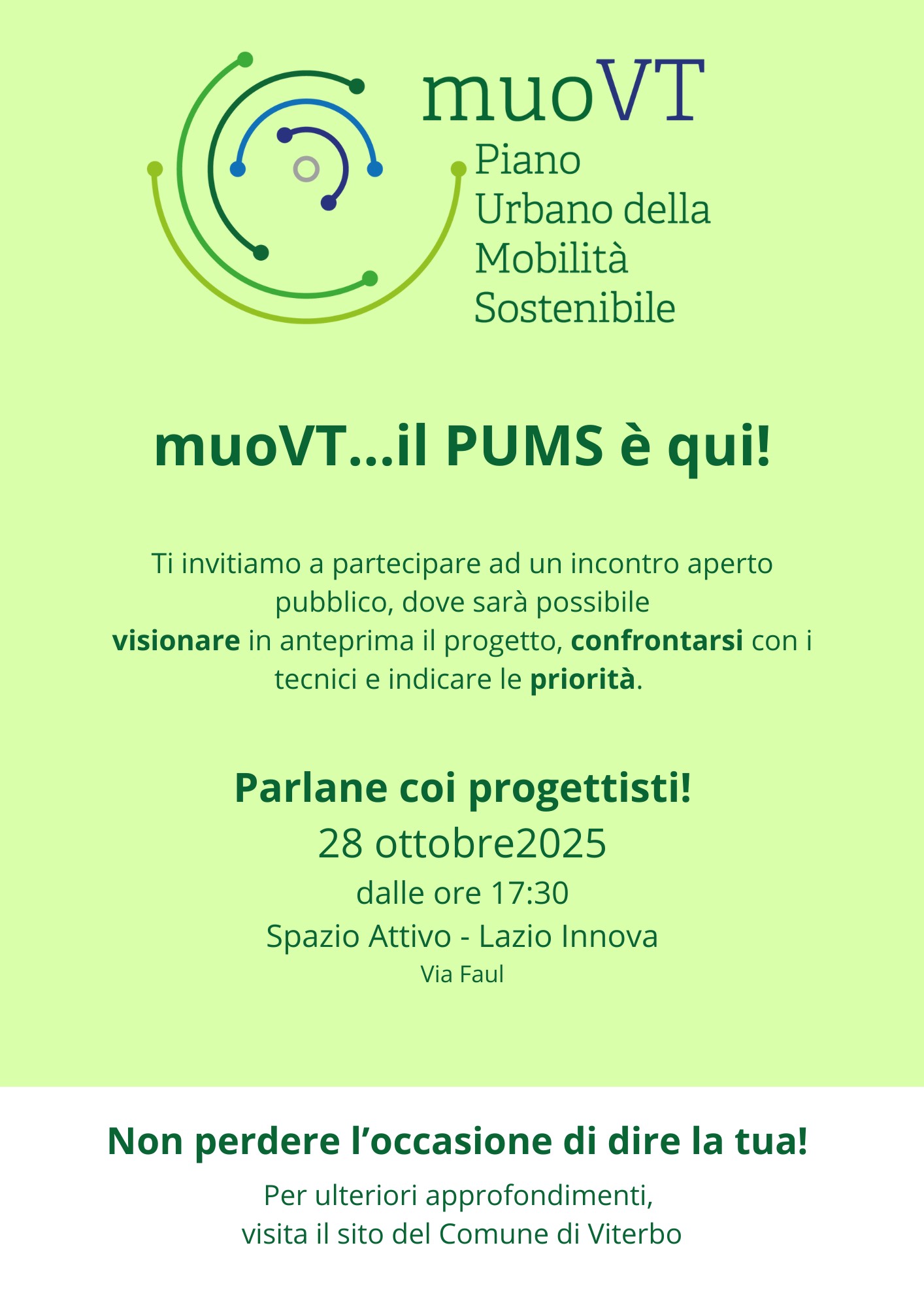Il Pums – Piano urbano della mobilità sostenibile del Comune di Viterbo si presenta in anteprima ai cittadini il prossimo 28 ottobre a partire dalle ore 17,30, presso lo Spazio attivo Lazio Innova di Valle Faul. L’incontro, organizzato dal Comune di Viterbo, assessorato alla viabilità e mobilità sostenibile, vedrà la partecipazione dei progettisti di TPS Pro srl e del gruppo di lavoro impegnato nella redazione del piano.