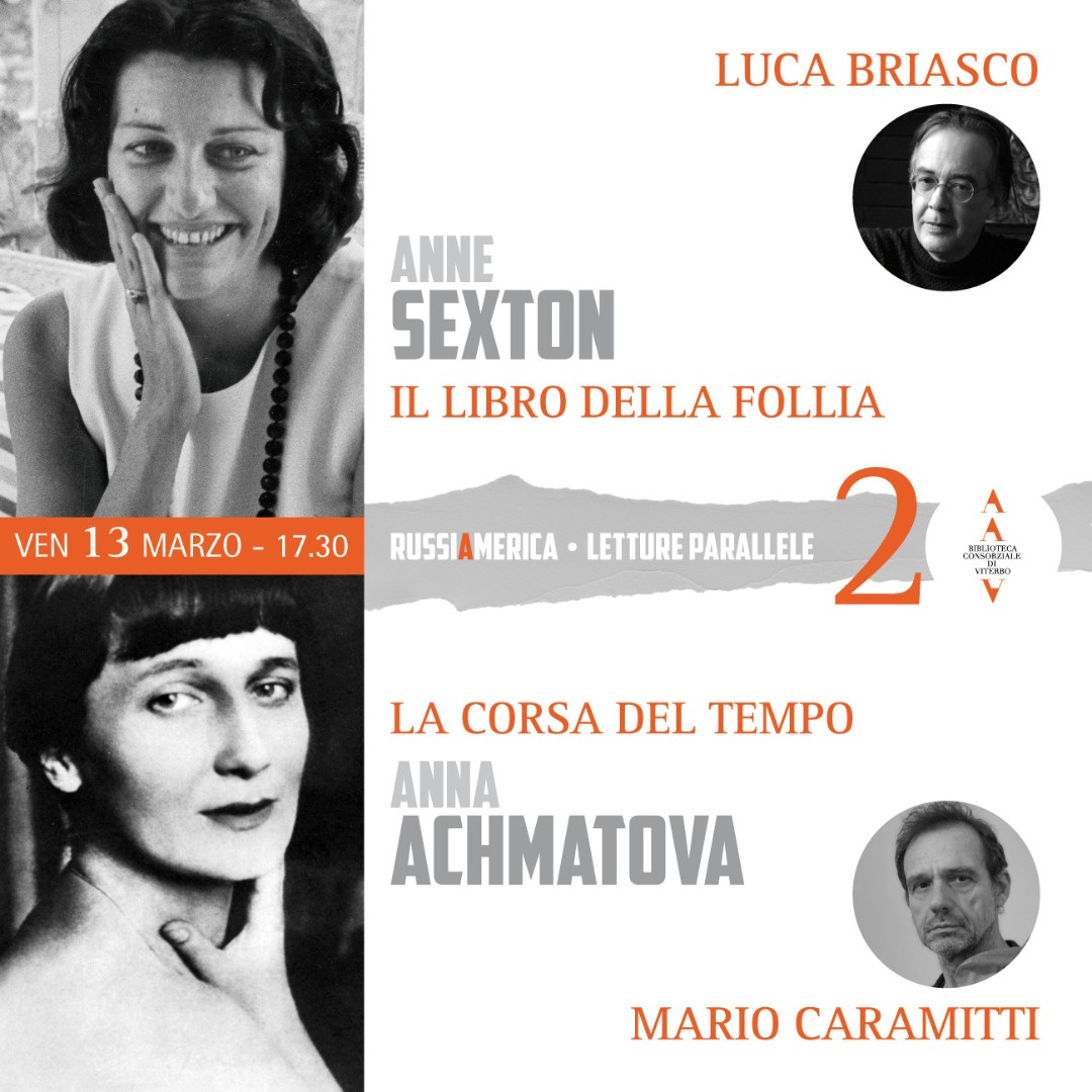 Domani, venerdì 13 marzo, alle 17.30, per il secondo appuntamento della nuova serie “RUSSIAMERICA – Letture parallele” dedicata al confronto tra letteratura russa e angloamericana, Luca Briasco e Mario Caramitti proporranno la lettura parallela di Anne Sexton e Anna Achmatova: “Tra confessione e trasfigurazione”.