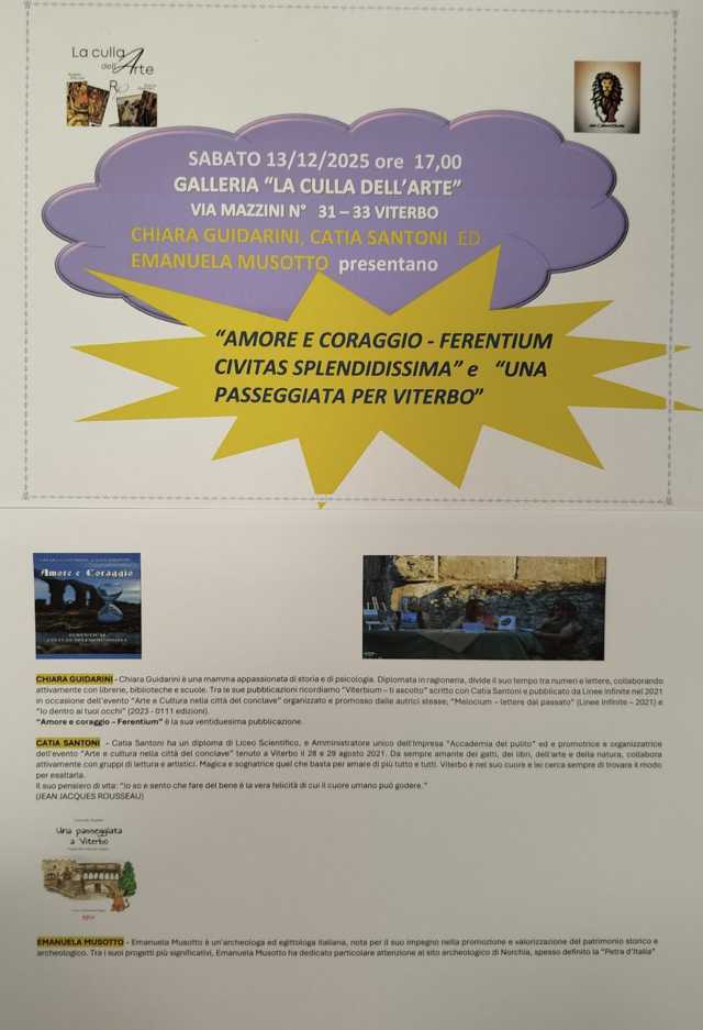 Sabato 13 dicembre alle ore 17.00, presso la Galleria “La Culla dell’Arte” – Via Mazzini 31-33 Viterbo, si terrà la presentazione di due libri: “Amore e Coraggio – Ferentium Civitas Splendidissima” di Chiara Guidarini e Catia Santoni e “Una passeggiata per Viterbo” di Emanuela Musotto. Sarà presente l’autrice reggiana Chiara Guidarini che, assieme a Catia Santoni, racconterà il libro dedicato al sito di Ferento, che vanta la prefazione dell’amica giornalista, purtroppo scomparsa, Rosanna De’Marchi.