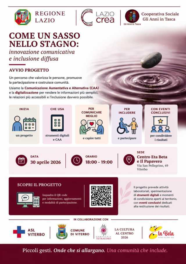 Alle ore 18:00, l’evento continua con la presentazione di “Come un sasso nello stagno”. L’iniziativa, ambiziosa e innovativa, è stata resa possibile grazie al sostegno della Regione Lazio, risultando vincitrice del bando Lazio Crea. Curato dalla cooperativa sociale Gli Anni in Tasca, il progetto rappresenta il “lancio del sasso”: un input generativo che darà vita, per un intero anno e oltre, a un ecosistema di apprendimento condiviso. È qui che prende forma la “Ragnatela”, un sistema dinamico di monitoraggio dove i progressi e le competenze vengono tracciati con trasparenza, costruendo giorno dopo giorno un vero Villaggio Educativo Diffuso.