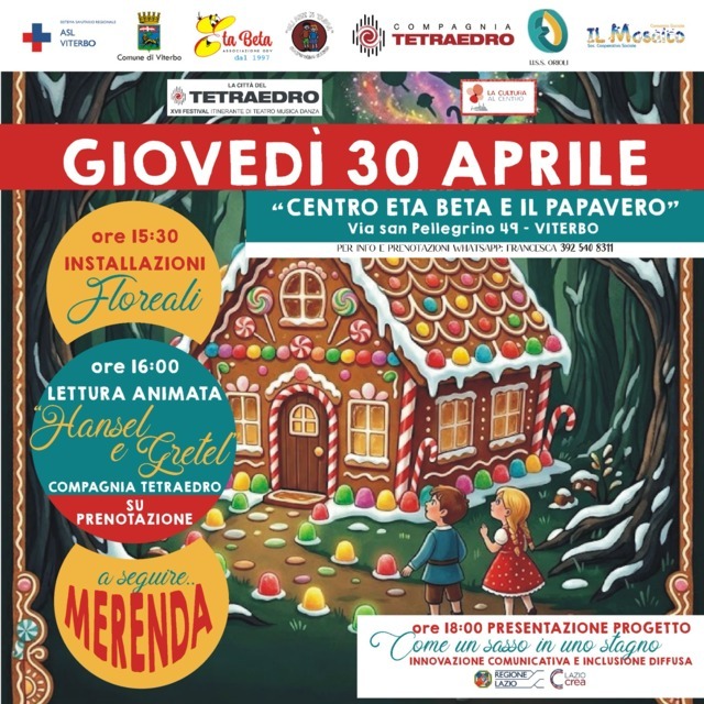 Dove si terrà la Lettura animata di Hansel e Gretel a cura della Compagnia Tetraedro, per trasportare grandi e piccoli nelle atmosfere incantate della narrazione ed un momento di convivialità attraverso una merenda a chilometro zero per valorizzare i prodotti del territorio.