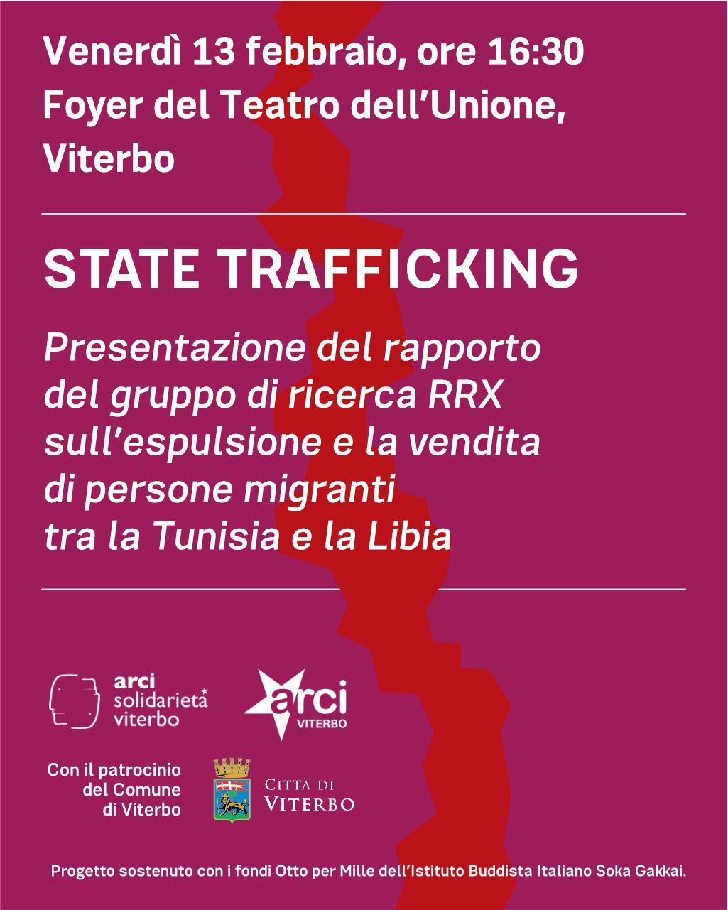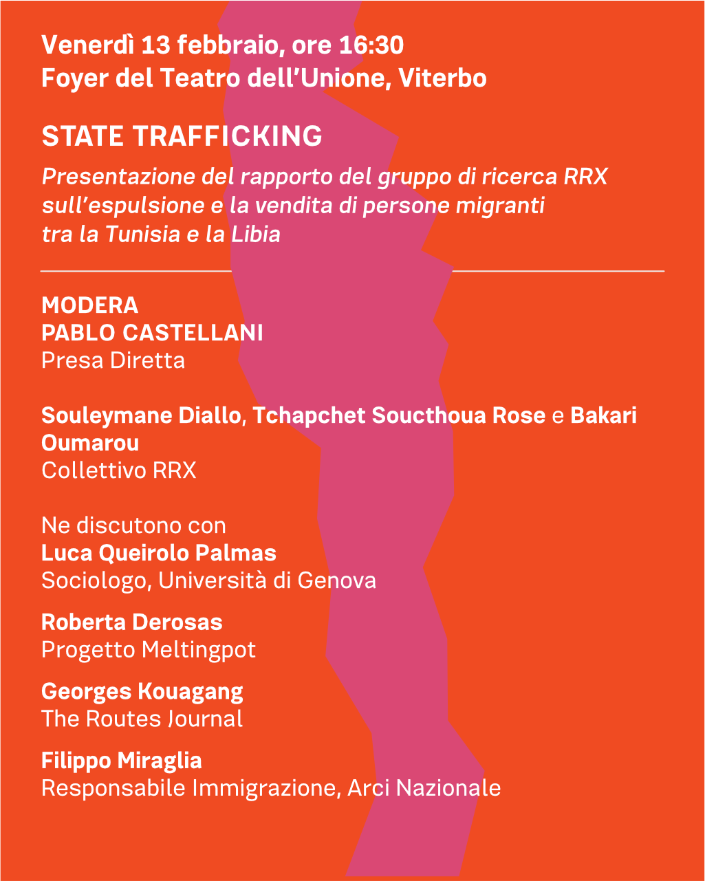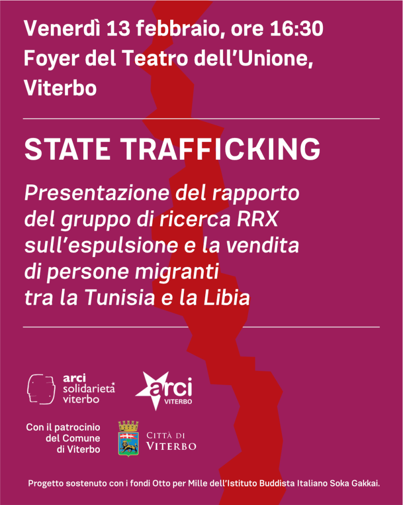Domani, 13 febbraio alle 16:30 Arci Solidarietà Viterbo e Arci Viterbo, con il patrocinio del Comune di Viterbo, presentano al foyer del Teatro dell’Unione il rapporto State Trafficking, espulsioni e vendita dei migranti dalla Tunisia alla Libia del gruppo di ricerca internazionale RRX. L’incontro sarà moderato dal giornalista di Presa diretta Pablo Castellani, con la partecipazione di Souleymane Diallo,Tchapchet Soucthoua Rose e Bakari Oumarou (Collettivo RRX), Luca Queirolo Palmas (Sociologo, Università di Genova), Roberta Derosas (Progetto Meltingpot), Georges Kouagang (The Routes Journal) e Filippo Miraglia (Responsabile Immigrazione Arci Nazionale).