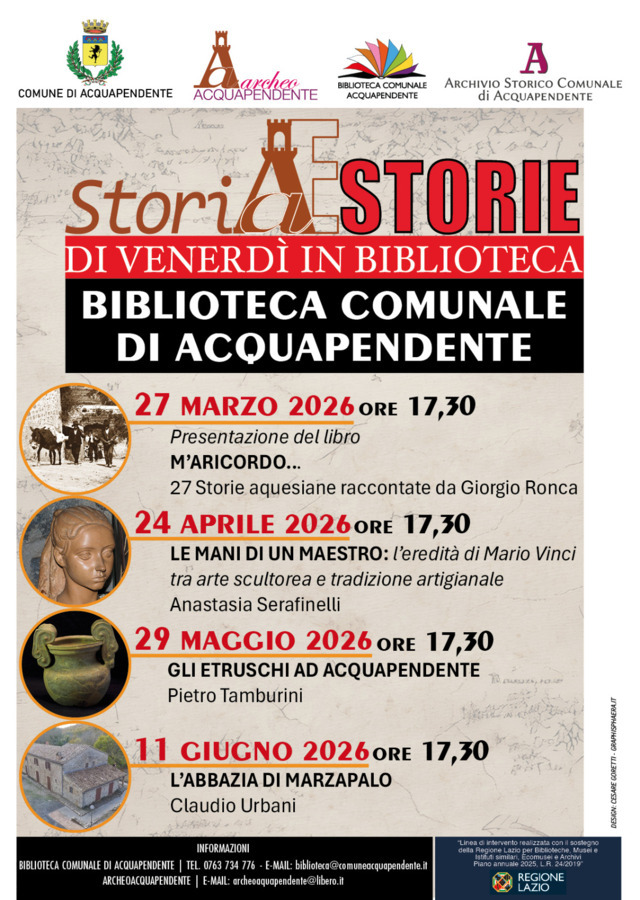 Prende il via ad Acquapendente il ciclo di incontri “Storia e storie”, ideato dall’Archeoclub locale in sinergia con il Comune e la Biblioteca – Archivio Storico.