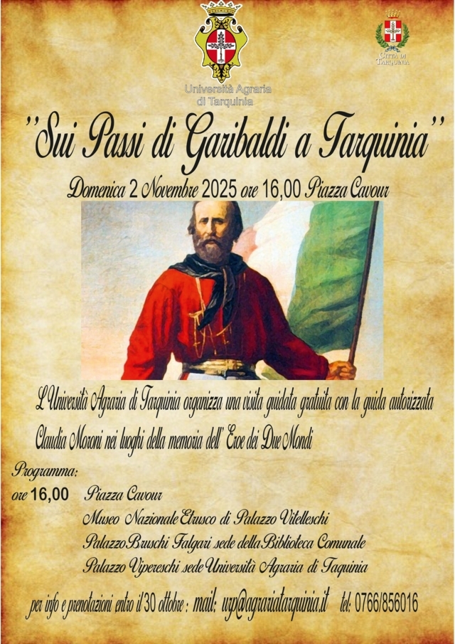 L’iniziativa, dal titolo “Sui passi di Garibaldi a Tarquinia”, propone una visita guidata gratuita di tre palazzi simbolo della città: Palazzo Vitelleschi, sede del Museo Nazionale Etrusco; Palazzo Bruschi Falgari, sede della Biblioteca comunale; e Palazzo Vipereschi, oggi sede dell’Università Agraria e luogo che, nel 1875, ospitò Garibaldi durante il suo soggiorno in città.