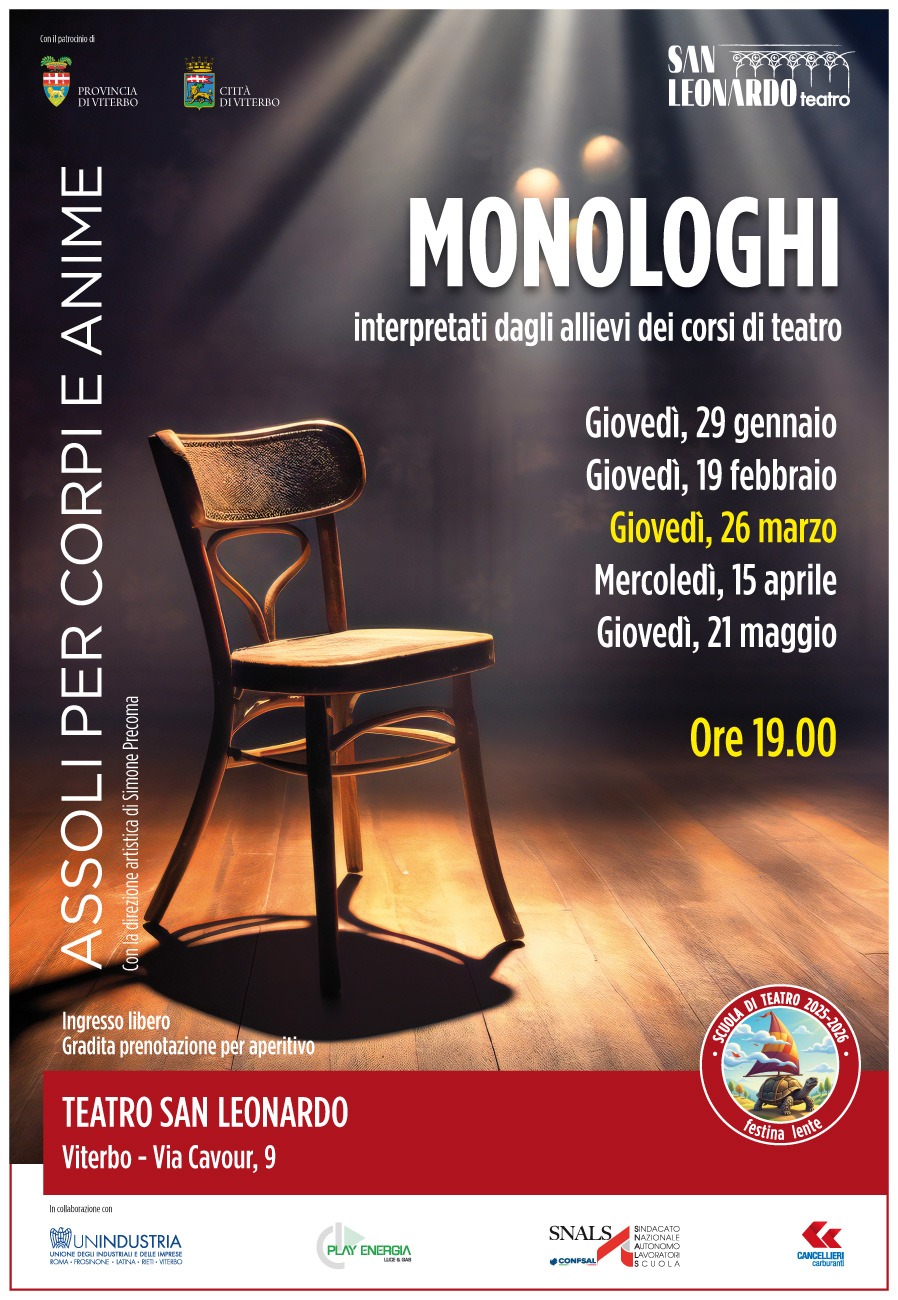Una sedia al centro della scena, una luce che si accende e una voce che prende spazio. Al Teatro San Leonardo di Viterbo proseguono i “Monologhi – assoli per corpi ed anime”, il format che negli anni ha saputo conquistare il pubblico puntando tutto sull’essenziale: l’attore, il testo, l’ascolto.