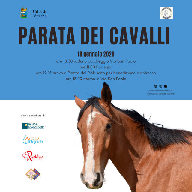 Per quanto riguarda invece la parata dei cavalli, il raduno è previsto alle ore 10,30 al parcheggio di largo San Paolo, per partire alle ore 11 in direzione del luogo della benedizione. Alle ore 13 è previsto il ritorno in largo San Paolo. La parata dei cavalli si svolgerà in collaborazione con il Centro ippico viterbese.