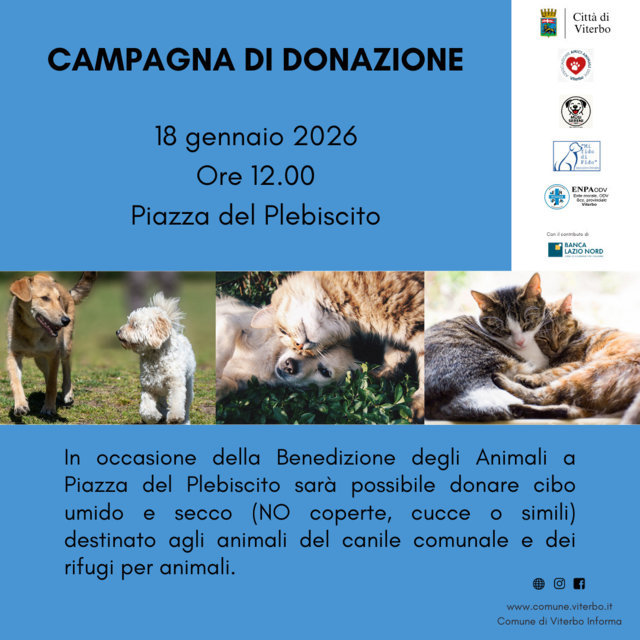 Dalle ore 11, in piazza del Plebiscito, saranno presenti le associazioni Amici Animali, Musi Sereni, Mi fido di Fido ed Enpa sez. provinciale Viterbo, a cui sarà possibile donare cibo (secco e umido) per gli amici a quattro zampe del canile comunale di Bagnaia e dei rifugi per animali.