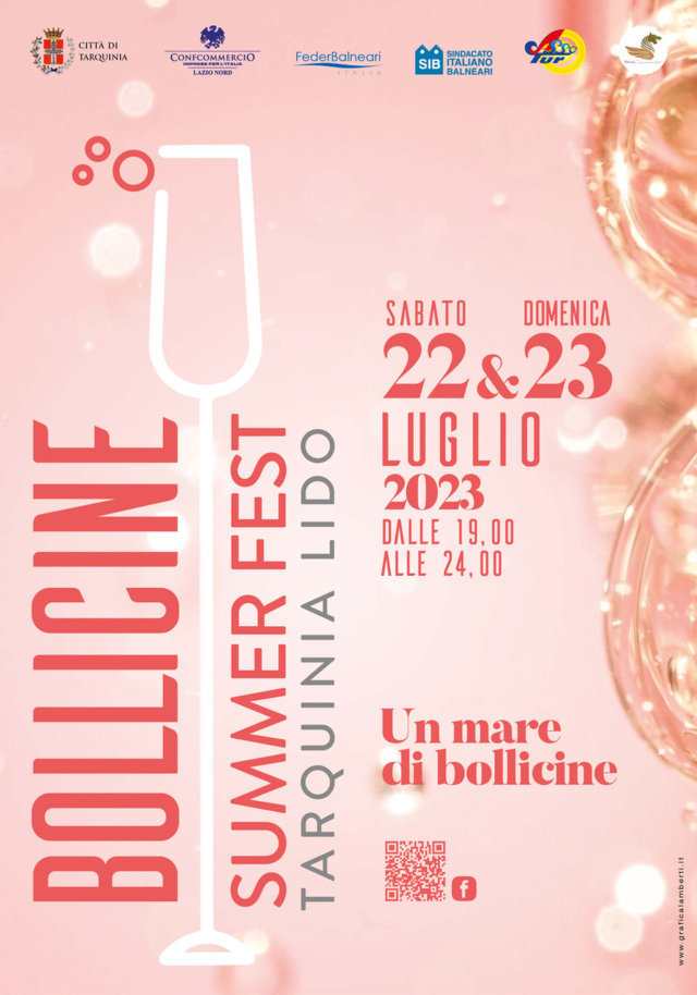 Sarà un fine settimana frizzante sul lungomare di Tarquinia Lido. Torna il 22 e 23 luglio, dalle 19 alle 24, il Bollicine Summer Fest con la sua seconda edizione. La rassegna organizzata da Confcommercio Lazio Nord, Sindacato Italiano Balneari, Federbalneari Italia, Assotur e Divini Commercianti, porterà sulla spiaggia tarquiniese un assaggio dell’Italia e delle sue bollicine più buone. Una due giorni per scoprire e sorseggiare in riva al mare, tra un calice e l’altro, l’eccellenza di alcune delle migliori cantine della Penisola. “Tarquinia Lido si presenterà nella sua veste più “frizzante” – affermano i promotori della manifestazione -. Siamo nel cuore di un’estate caldissima e quale modo migliore di trascorrerla se non all’aperto, in spiaggia, dal tramonto alla sera degustando le bollicine”.