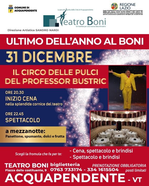 Torna al Teatro Boni di Acquapendente il tradizionale appuntamento dell’ultimo dell’anno per festeggiare insieme l’arrivo del 2026 con una serata elegante e divertente, all’insegna del buon gusto e dello spettacolo di qualità. Mercoledì 31 dicembre 2025 è in programma una cena nella splendida cornice del teatro in abbinamento con uno spettacolo che vedrà sul palco Sergio Bini, in arte Bustric, con lo spettacolo “Il Circo delle Pulci del professor Bustric“. A mezzanotte brindisi augurale con spumante, panettone, dolce e frutta.
