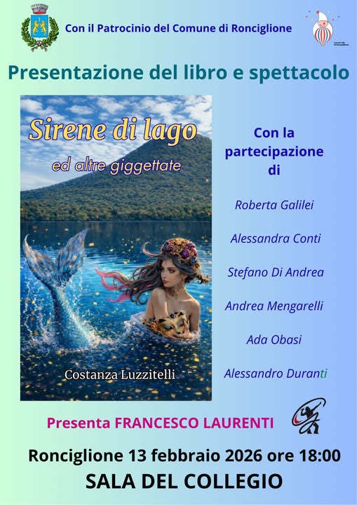 Un viaggio tra parole, suggestioni e atmosfere incantate attende il pubblico venerdì 13 febbraio 2026 alle ore 18:00, presso la Sala del Collegio di Ronciglione, in occasione della presentazione del nuovo libro di Costanza Luzzitelli, “Sirene di lago ed altre giggettate”.