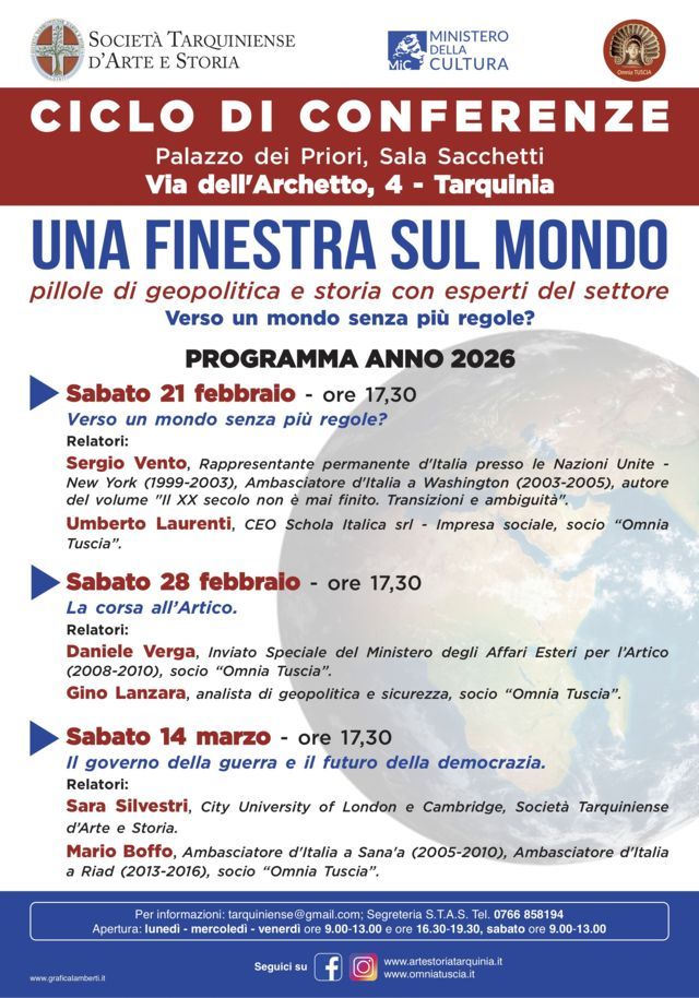 La Società Tarquiniense d’Arte e Storia (Stas), in collaborazione con l’associazione Omnia Tuscia di Viterbo e con il patrocinio del Ministero della Cultura, presenta il ciclo di conferenze “Una finestra sul mondo”, un percorso di approfondimento dedicato ai grandi temi della geopolitica e della storia contemporanea. Gli incontri a ingresso libero si svolgeranno presso la Sala Sacchetti, al civico 4 di via dell’Archetto, a Tarquinia, e offriranno al pubblico strumenti di lettura e interpretazione delle trasformazioni globali, attraverso il contributo di diplomatici, accademici ed esperti di primo piano.