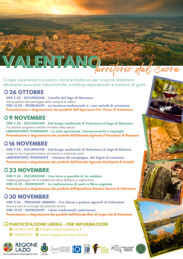 Le attività si svolgeranno le domeniche dal 26 ottobre al 30 novembre 2025, con appuntamenti dedicati alle escursioni e ai laboratori. Il programma completo è disponibile sul sito del Museo della preistoria della Tuscia e della Rocca Farnese di Valentano: www.museovalentano.it