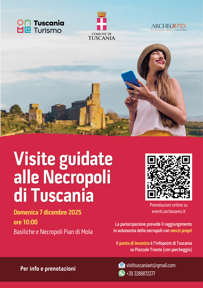L’Ufficio Turistico di Tuscania, in collaborazione con Archeoares, organizza una nuova visita guidata dedicata alla scoperta delle storiche Basiliche della città e della necropoli etrusca di Pian di Mola, nota per la particolare “Tomba a Casa con Portico” e per la caratteristica piazzetta funeraria con sepolture a pozzo risalenti ai primi decenni del V secolo a.C.