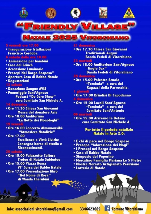 Dopo l’inaugurazione con l’accensione dell’albero e delle luminarie e le iniziative dell’ultimo weekend, proseguono a Vitorchiano gli appuntamenti del Friendly Village 2025-26, ormai entrato nel vivo. Un ricco cartellone tra tradizioni, socialità ed emozioni che accompagnerà residenti e visitatori fino al 6 gennaio. Il tutto grazie all’impegno del Comune e delle numerose associazioni del territorio. Il prossimo fine settimana si preannuncia particolarmente ricco di eventi per grandi e piccoli. Tre intensi giorni per ritrovarsi, sorridere ed emozionarsi.