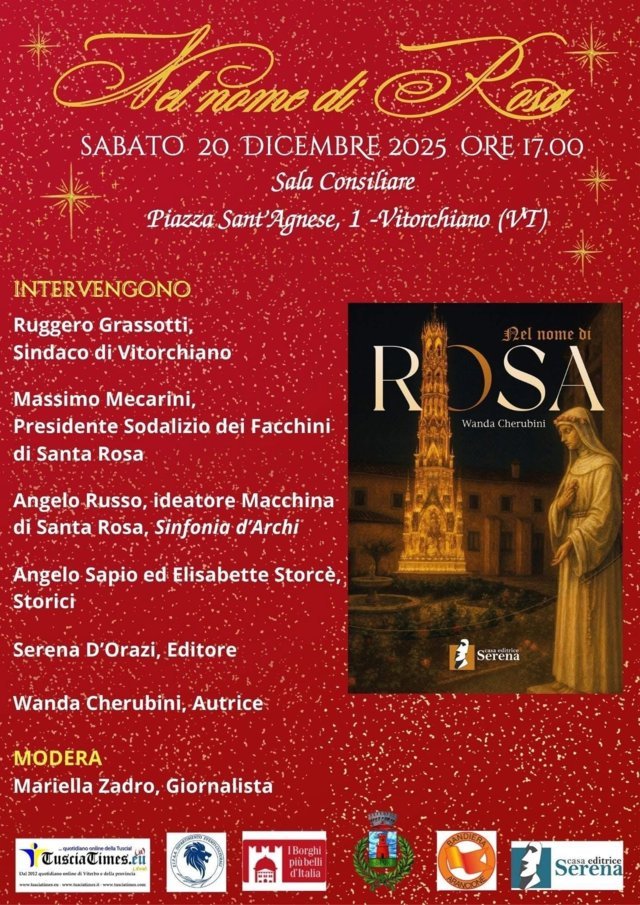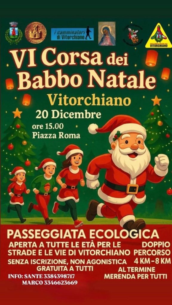 Sabato 20 dicembre, nella cui mattina saranno anche in vendita le ciambelle di San Michele a cura del Comitato Festeggiamenti San Michele Arcangelo, alle ore 15 il Palazzetto della Cultura ospita il torneo natalizio di Subbuteo “Un goal per gli auguri!” a cura del S.C. Moai Vitorchiano Subbuteo Club. Contemporaneamente in Piazza Roma prenderà il via la sesta edizione della Corsa dei Babbo Natale, oltre la passeggiata ecologica non agonistica, gratuita e aperta a tutti, con doppio percorso (8 km e 4 km) e al termine merenda. Alle 17 in sala consiliare presentazione del libro “Nel nome di Rosa” di Wanda Cherubini, con la partecipazione del sindaco Ruggero Grassotti, del presidente del Sodalizio Facchini di Santa Rosa Massimo Mecarini, dell’artista Angelo Russo e di storici e giornalisti locali.