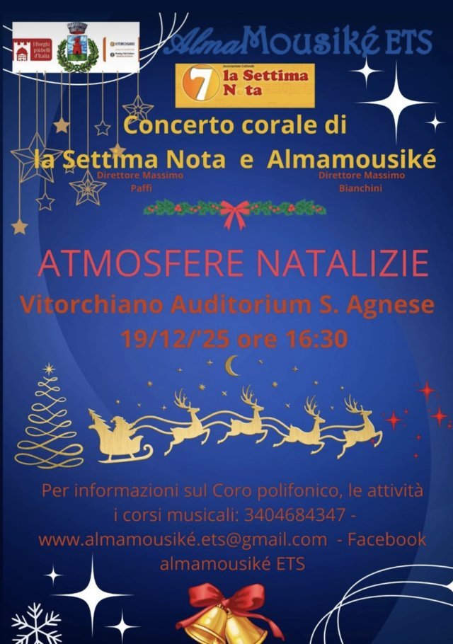 Si parte venerdì 19 dicembre alle ore 16.30 con “Atmosfere natalizie“, concerto corale con La Settima Nota (direttore Massimo Paffi) e Almamousiké (direttore Massimo Bianchini) presso l’Auditorium Sant’Agnese. A seguire, alle ore 18 nella sala consiliare del Comune la tradizionale cerimonia di consegna degli attestati di benemerenza civica e delle borse di studio agli studenti vitorchianesi meritevoli.