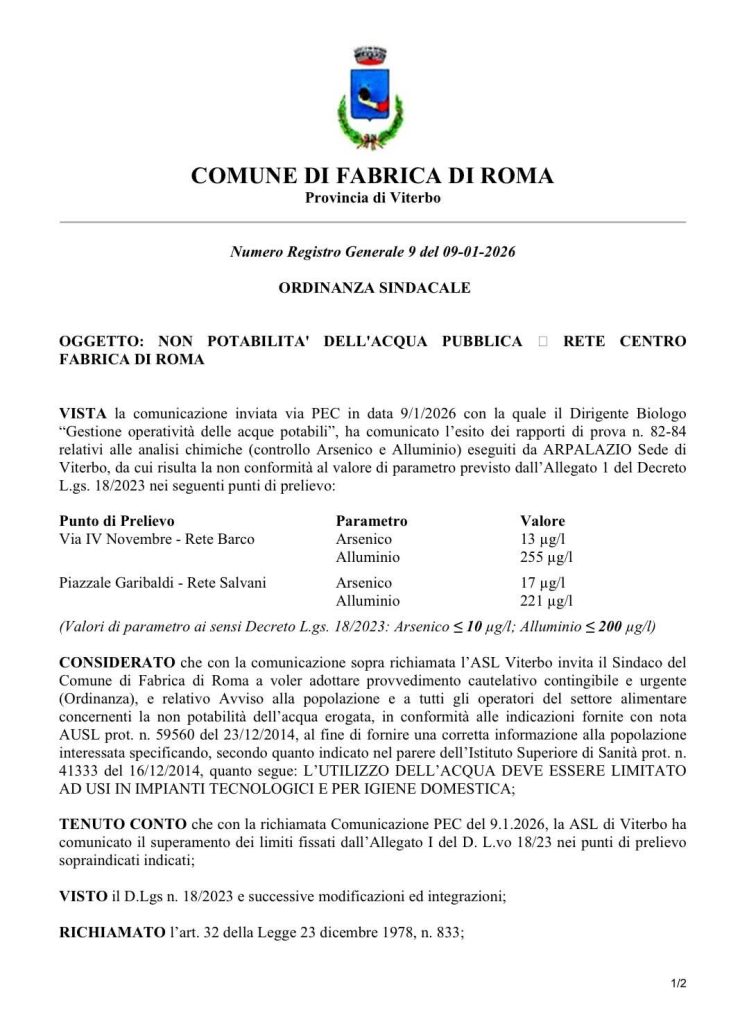 Nel Comune di Fabrica di Roma l’acqua destinata al consumo umano è nuovamente dichiarata non potabile. Dopo anni segnati da criticità legate alla presenza di arsenico, fluoruri e contaminazioni batteriche, le ultime analisi evidenziano anche un superamento dei limiti consentiti per l’alluminio.