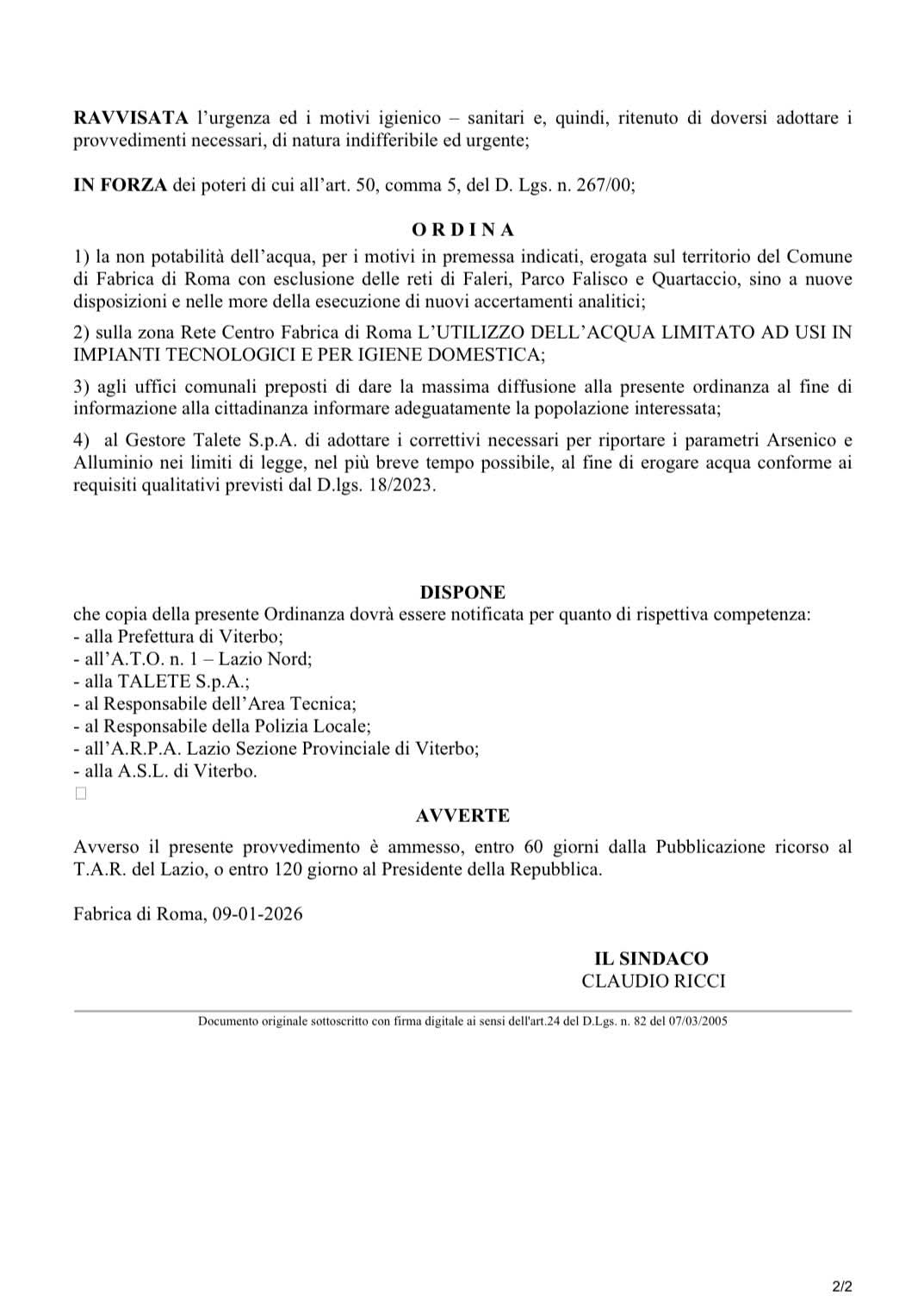 Nel Comune di Fabrica di Roma l’acqua destinata al consumo umano è nuovamente dichiarata non potabile. Dopo anni segnati da criticità legate alla presenza di arsenico, fluoruri e contaminazioni batteriche, le ultime analisi evidenziano anche un superamento dei limiti consentiti per l’alluminio.