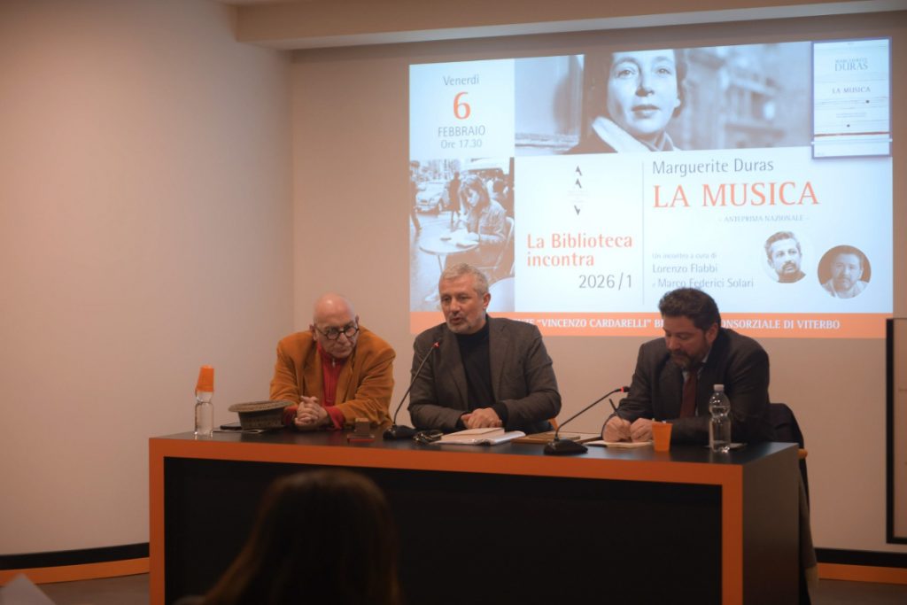 Grande partecipazione di pubblico ieri sera alla Biblioteca Consorziale di Viterbo per un incontro di straordinario rilievo culturale, dedicato alla presentazione in anteprima nazionale di “La musica”, testo inedito di Marguerite Duras, pubblicato da L’orma editore e tradotto per la prima volta in italiano.
