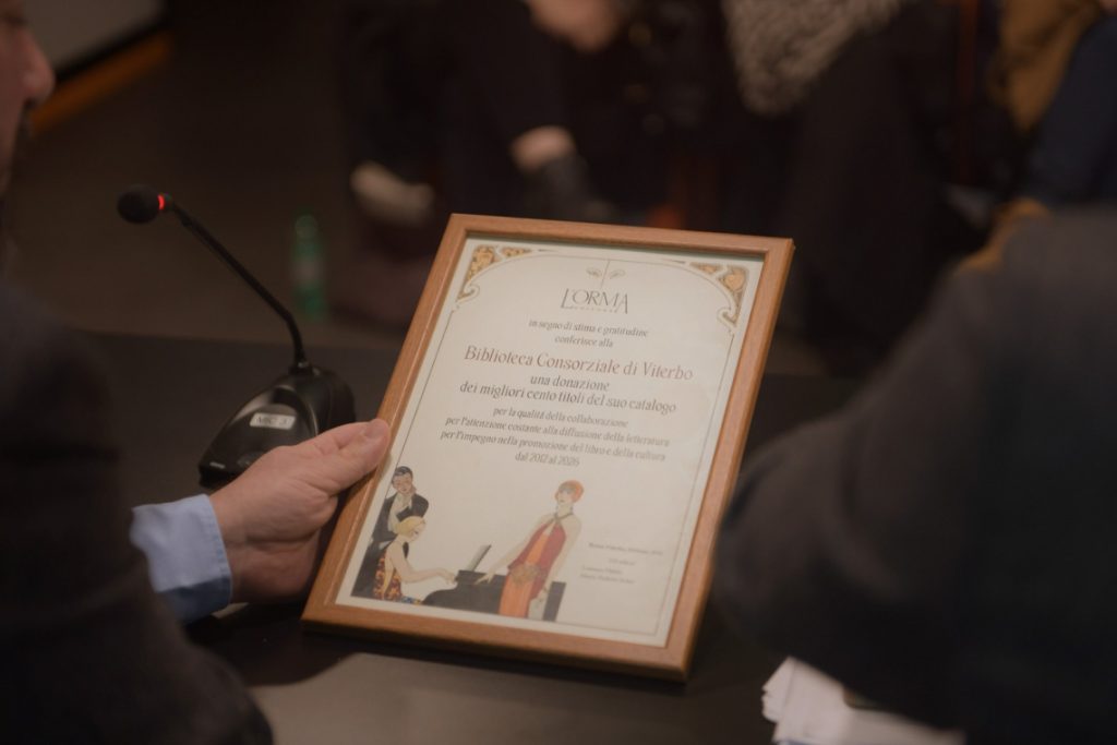 «L’orma editore in segno di stima e gratitudine conferisce alla Biblioteca Consorziale di Viterbo una donazione dei migliori cento titoli del suo catalogo per la qualità della collaborazione, per l’attenzione costante alla diffusione della letteratura, per l’impegno nella promozione del libro e della cultura dal 2012 al 2026».