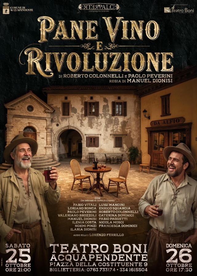 Così come voluto dal Presidente dell’Associazione Teatro Boni Tolmino Piazzai, dalla Compagnia Retropalco e dal Comune di Acquapendente. Nella location di Piazza della Costituente 9 Sabato 25 alle ore 21.00 e Domenica 26 Ottobre alle ore 17.30 “tirerà su la saracinesca” l’osteria di Alfio ed i suoi attori-ospiti: Fabio Vitali, Loriano Ronca, Paolo Peverini, Valeriano Brozzoli, Manuel Dionisi, Ilenia Costa, Noemi Pinzi, Ilaria Dionisi, Luigi Mancini, Enrico Squarcia, Roberto Colonnelli, Caterina Dominici, Fabio Paggetti, Nicola Mosci, Francesca Dominici, che illuminati e vocalizzati da Lorenzo Ferrigno tra un fiasco di vino sempre pieno e la storia che bussa alla porta intrecceranno il proprio destino con il profumo del pane ed il tintinnio dei bicchieri parlando di politica, amore e rivoluzione ma senza prendersi troppo sul serio.