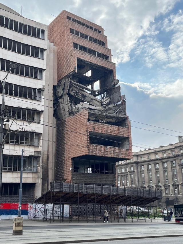 Durante una delle nostre lunghissime passeggiate, mentre percorriamo una delle arterie principali della città, all’incrocio tra via Kneza Miloša e via Nemanjina, tra edifici istituzionali e ambasciate, alziamo lo sguardo e restiamo in silenzio davanti alla vista agghiacciante dei due palazzi del Ministero della Difesa, uno di fronte all’altro, bombardati dalla NATO nel 1999. Colpiti più volte, oggi patrimonio dell’umanità UNESCO, le macerie sono un monumento alla memoria delle vittime dei bombardamenti e agli orrori della guerra.