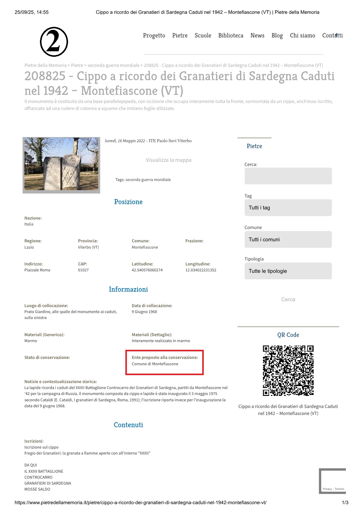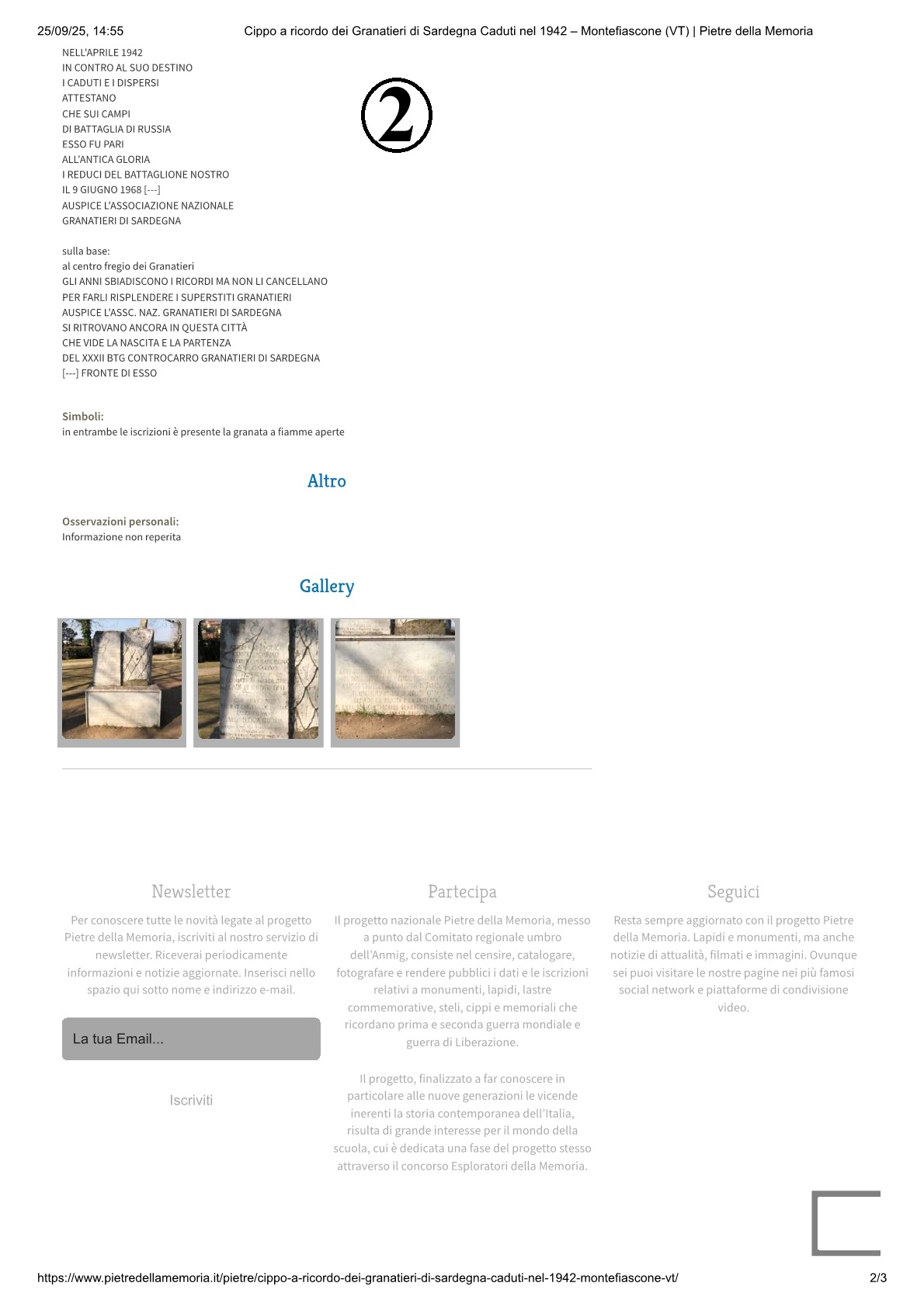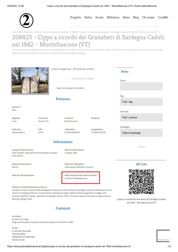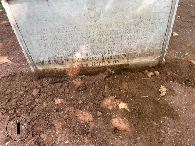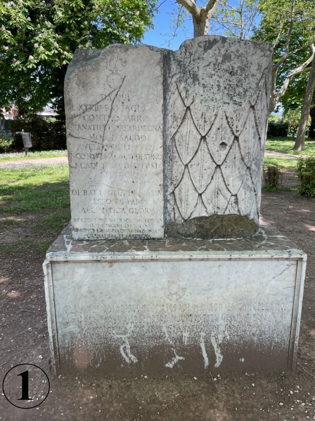 Il terzo, a pochi passi, è “La lapide ricorda i caduti del XXXII Battaglione Controcarro dei Granatieri di Sardegna, partiti da Montefiascone nel ’42 per la campagna di Russia. Il monumento composto da cippo e lapide è stato inaugurato il 3 maggio 1975, secondo Cataldi (E. Cataldi, I granatieri di Sardegna, Roma, 1991); l’iscrizione riporta invece per l’inaugurazione la data del 9 giugno 1968”. (Fonte “Pietre della Memoria” ) (https://www.pietredellamemoria.it/pietre/cippo-a-ricordo-dei-granatieri-di-sardegna-caduti-nel-1942-montefiascone-vt/) (foto 2).