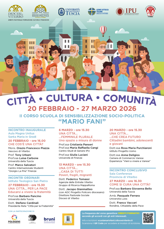 Sul medesimo orizzonte vuole camminare la Scuola “Mario Fani”, che nei prossimi incontri si sposterà all’Istituto Teologico “San Pietro”, in viale Armando Diaz: l’appuntamento è ogni venerdì (dalle 15.30 alle 18.30) dal 27 febbraio al 20 marzo. La chiusura del corso sarà il 27 marzo alle ore 16 presso la Sala Conferenze della Provincia.