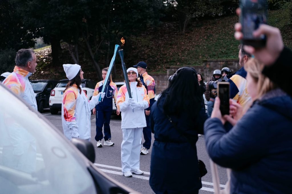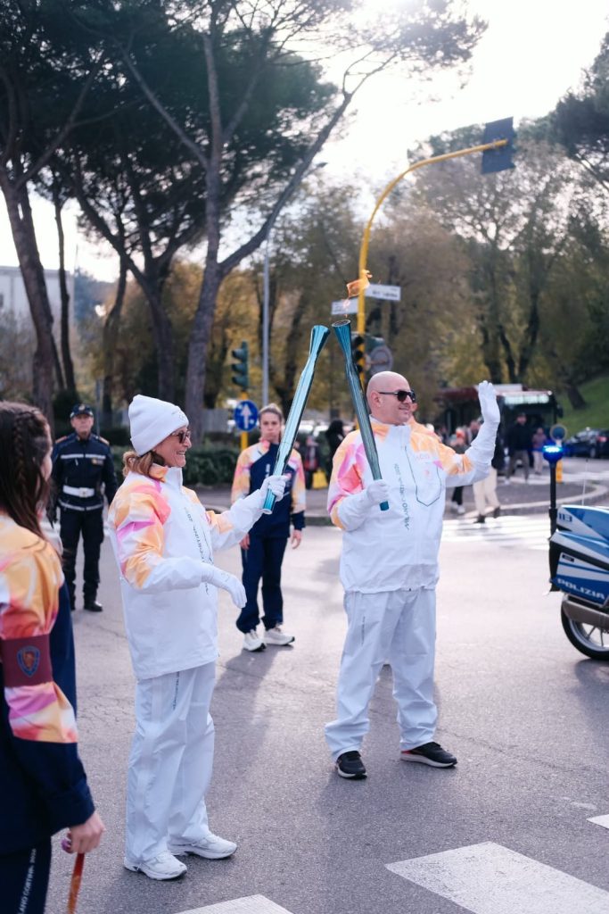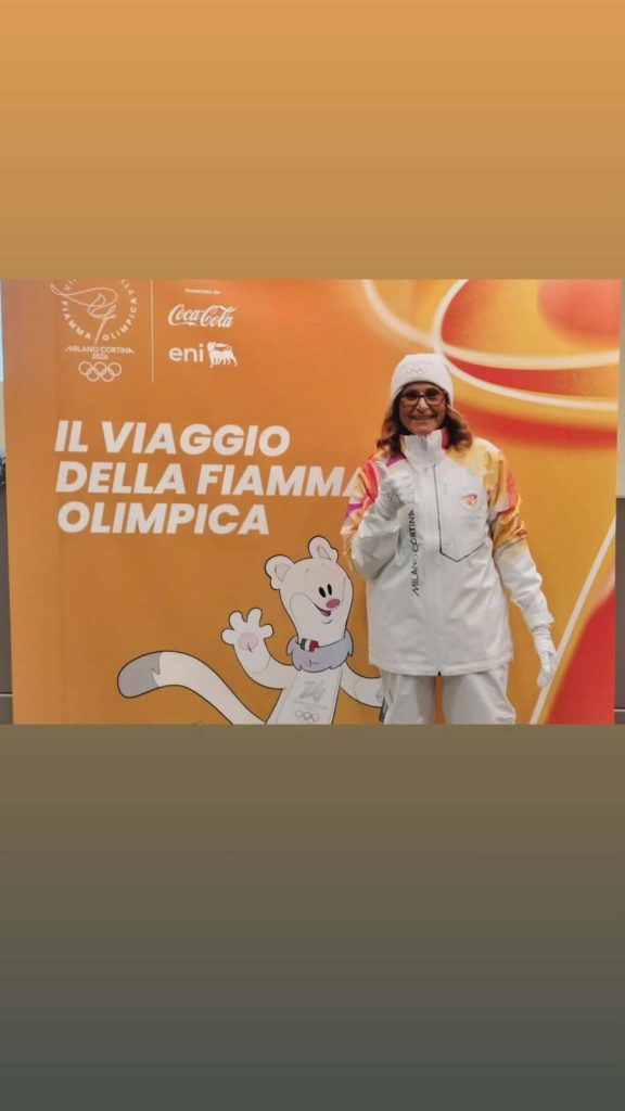 Così domenica 7 dicembre, sveglia all’alba, mi sono recata a Roma in compagnia di mia figlia Arianna all’appuntamento con il team dell’organizzazione e gli altri tedofori, consegna delle tute e breve discorso di ciò che avremmo dovuto fare con la torcia e con il pubblico presente. Una volta che mi hanno lasciato alla partenza della tappa, ho aspettato l’ arrivo del tedoforo, abbiamo fatto il Torch Kiss per accedere la mia Torcia e sono partita! Gioia infinita, felicità immensa e gratitudine per aver avuto l’opportunità di essere una Tedofora di Milano Cortina 2026!