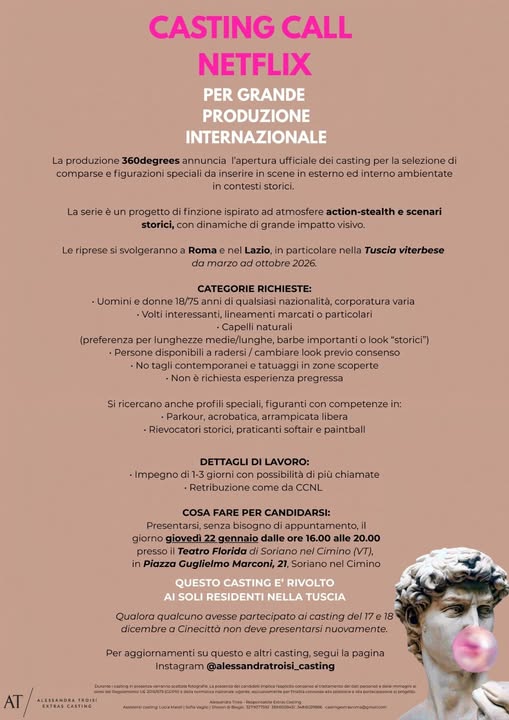 Open casting call nella Tuscia per una grande produzione internazionale targata Netflix. La produzione 360degrees ha annunciato l’apertura ufficiale dei casting per la selezione di comparse e figurazioni speciali da inserire in una nuova serie ambientata in contesti storici, caratterizzata da un’atmosfera action-stealth e da scenari di forte impatto visivo.