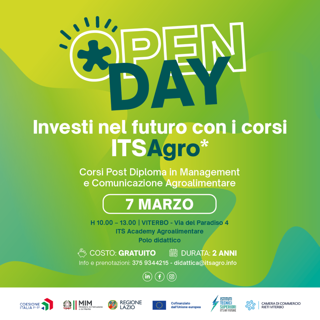 ITS Agro (Fondazione ITS Academy Agroalimentare) organizza un open day venerdì 7 marzo, dalle ore 10.00 alle 13.00, presso la sede di Viterbo, Via del Paradiso 4, per presentare i percorsi biennali post diploma gratuiti e far conoscere da vicino il metodo ITS: lezioni, laboratori, project work e stage in azienda.