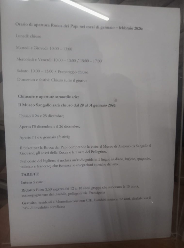 A Montefiascone si accende la polemica sugli orari di apertura della Rocca dei Papi e del Museo dell’Architettura di Antonio da Sangallo il Giovane. A sollevare il caso sono stati due turisti che hanno trovato gli oraridi apertura di Rocca dei Papi e del Museo del Sangallo, entrambi chiusi dal sabato pomeriggio fino al martedì,