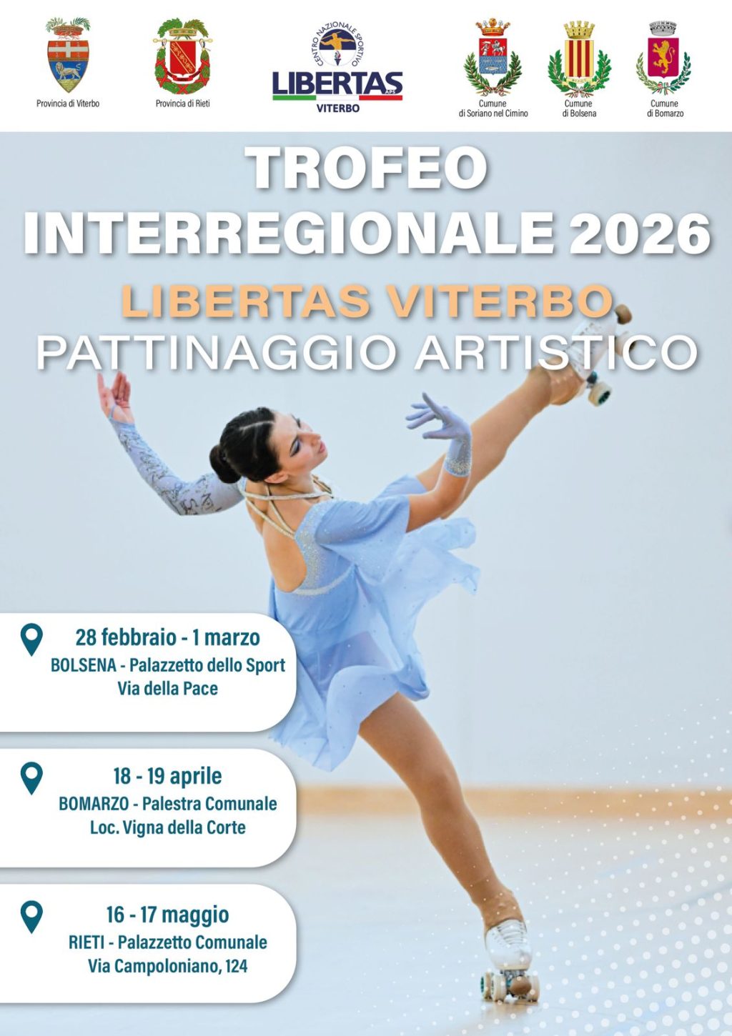 Il giorno 1° marzo, a partire dalle ore 9:00, presso il Palazzetto Comunale di Bolsena, sito in Via della Pace, si terrà la prima tappa del Campionato Interregionale di Pattinaggio Artistico organizzato da Libertas Viterbo.