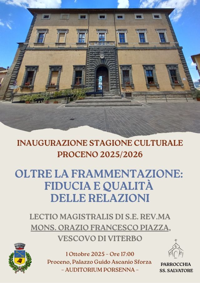 Sua eccellenza S.E. Rev.ma Mons. Orazio Francesco Piazza inaugurerà la stagione culturale di Proceno, aprendo il ciclo di eventi il 1 ottobre 2025 con una lectio magistralis dal titolo” Oltre la frammentazione: fiducia e qualità delle relazioni “. Le comunità del Territorio insieme al Vescovo Orazio stanno promuovendo un cammino d’incontro capace di portare a una lettura da più prospettive, salvaguardando la specificità di ogni singola realtà.