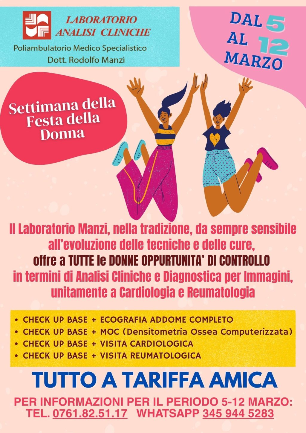 In occasione della “Settimana della Donna”, dal 5 al 12 marzo, il Laboratorio Analisi Manzi promuove un’iniziativa speciale dedicata alla prevenzione e al benessere femminile, mettendo a disposizione una serie di pacchetti Check Up completi a “Tariffa Amica”.