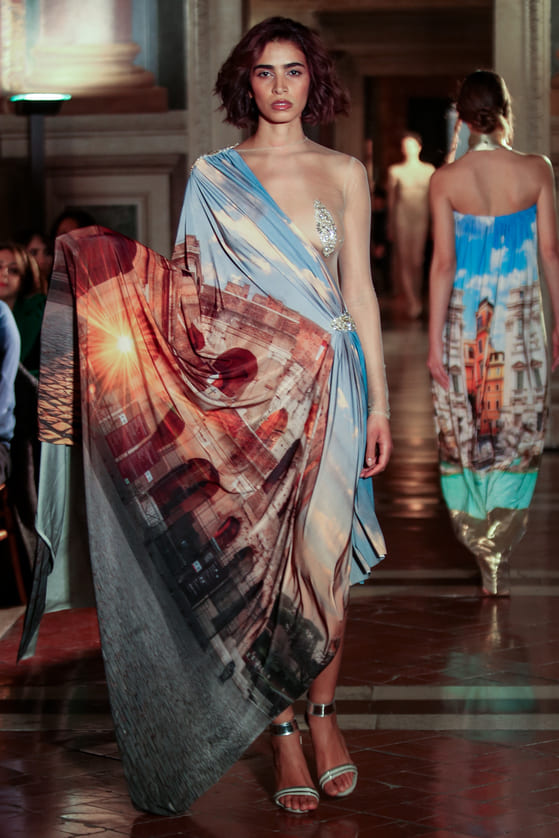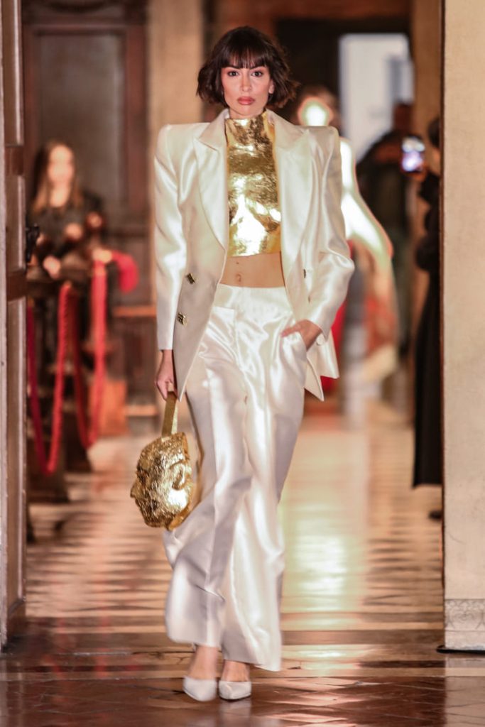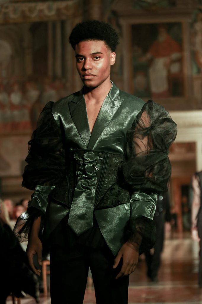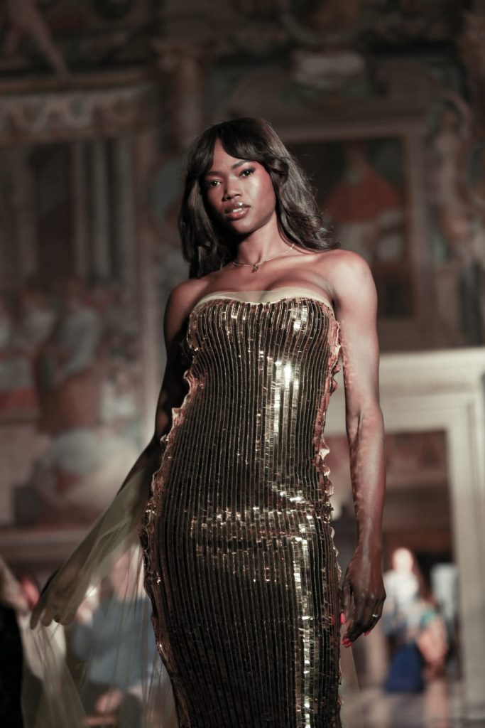 A colpire il pubblico è stata anche la proposta di Meraki Allure di Mo Cisse, il fondatore di questa linea sostenibile di alta moda, che ha saputo trasformare il concetto di abbigliamento in un simbolo di forza e rinascita. Mo Cisse, con la sua visione unica, identifica la moda che non è solo ciò che indossiamo, è come ci sentiamo. Ogni donna ha il diritto disentirsi potente, bella, pronta a vincere qualsiasi battaglia. A rappresentare la maison il responsabile per l’Italia Daniele Oreste.