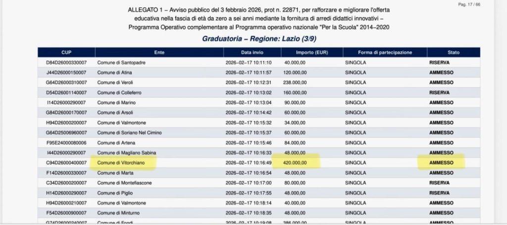 Il Comune di Vitorchiano ha ricevuto la conferma del finanziamento per l’acquisto degli arredi scolastici destinati alla nuova scuola per l’infanzia e al nuovo nido comunale attualmente in fase avanzata di costruzione in località Pallone.